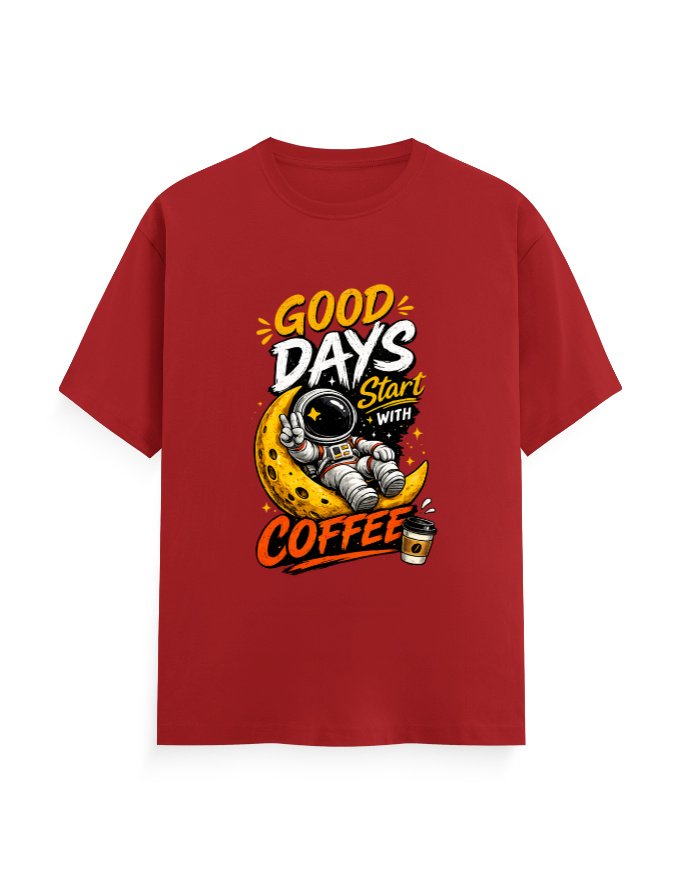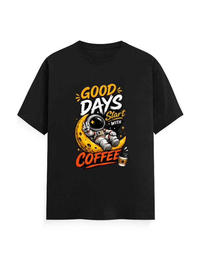 This fun and vibrant “Good Days Start With Coffee” graphic T-shirt is perfect for coffee lovers who live for that first sip. Featuring a cute astronaut chilling on the moon with a coffee vibe, this design blends humor, lifestyle, and aesthetic streetwear.