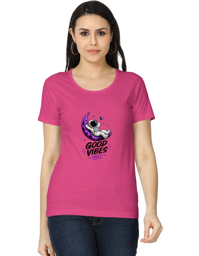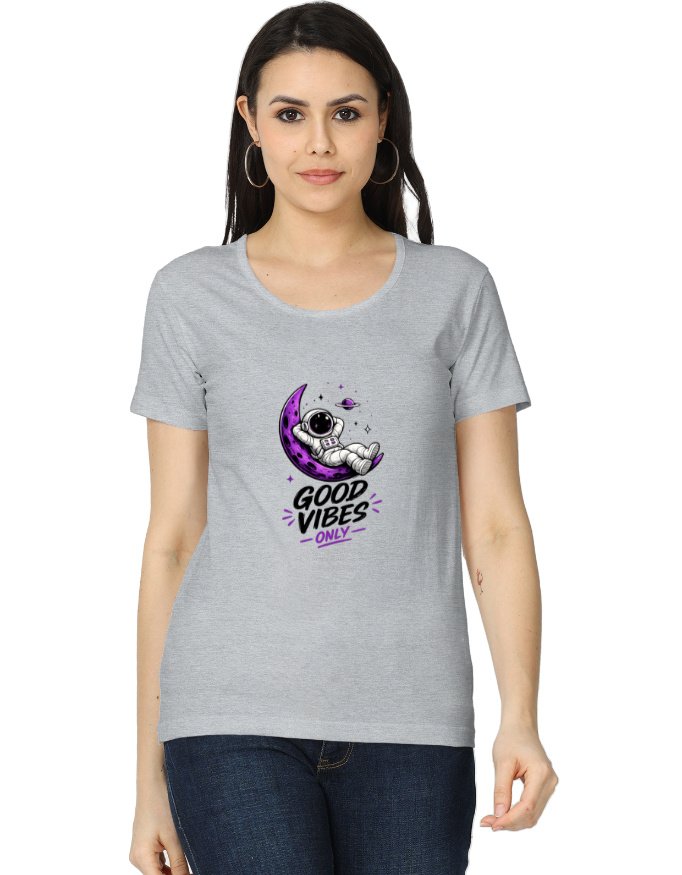 This adorable “Good Vibes Only” graphic T-shirt is perfect for women who love positive energy, aesthetic fashion, and playful designs. Featuring a cute astronaut chilling on a moon, this tee brings a calm, dreamy vibe to your everyday style.