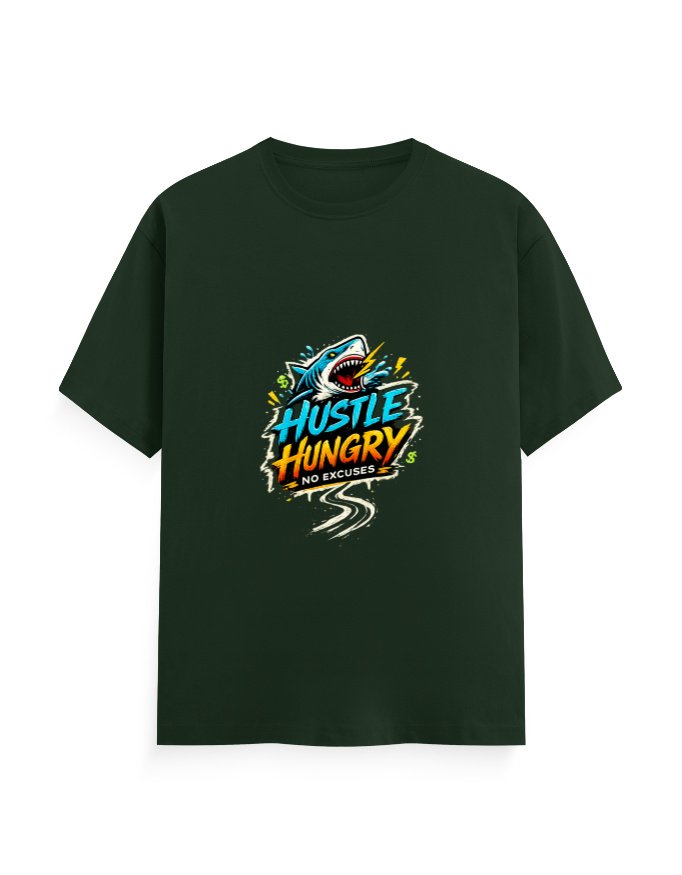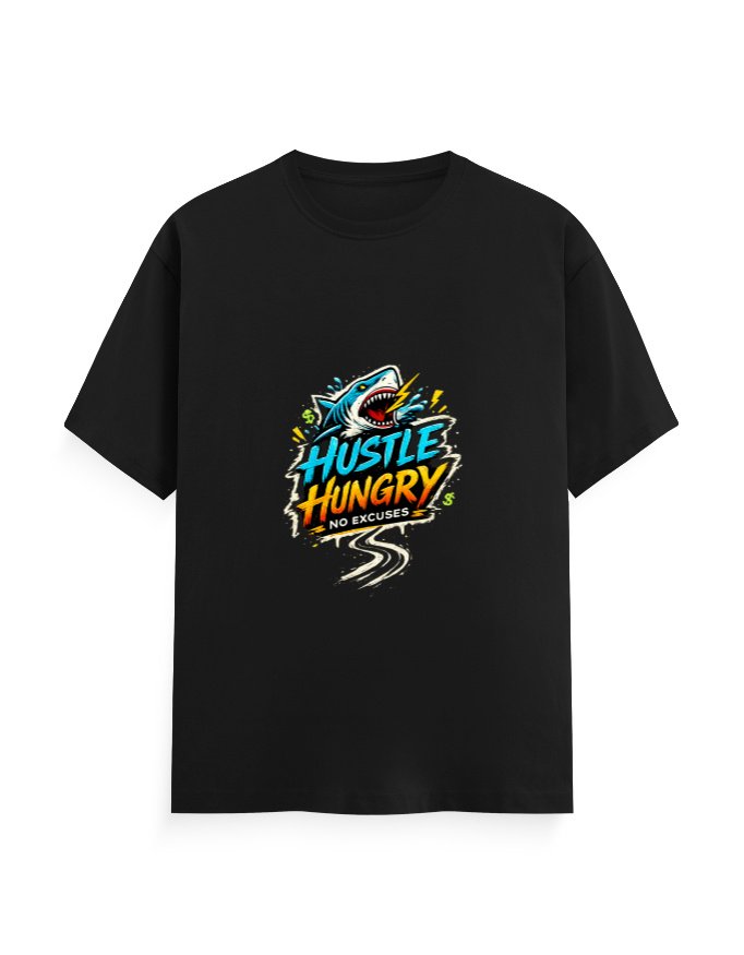 This bold “Hustle Hungry – No Excuses” graphic T-shirt is built for those who refuse to settle. Featuring a fierce shark design with graffiti-style typography, this tee represents aggression, ambition, and relentless hustle.