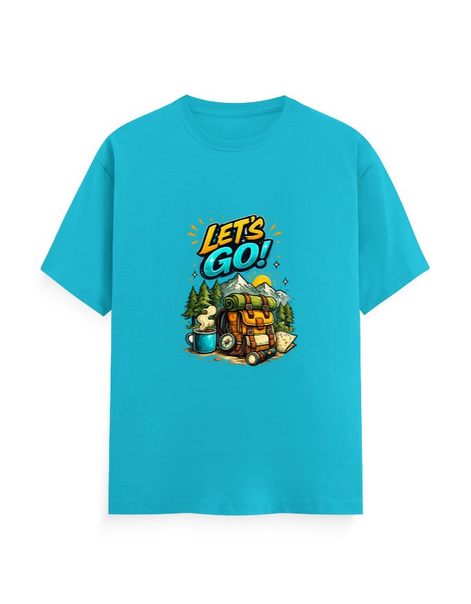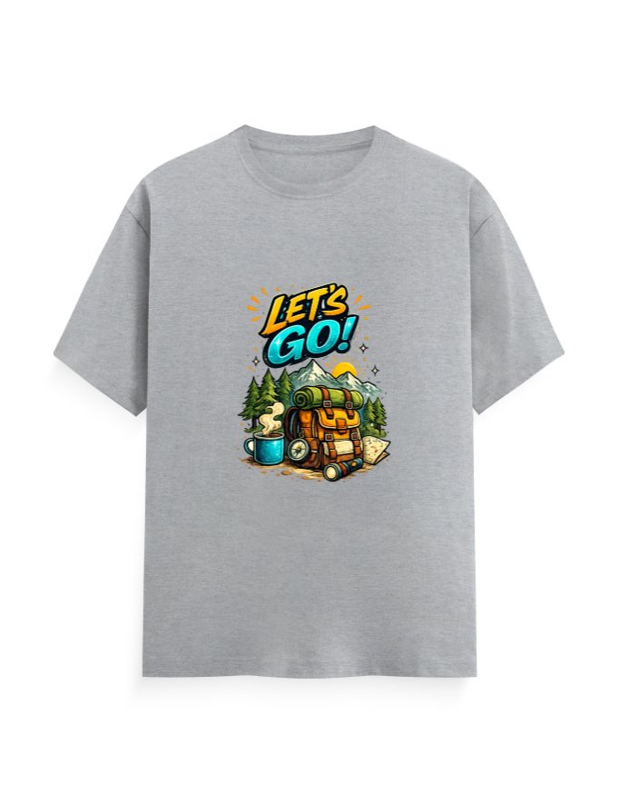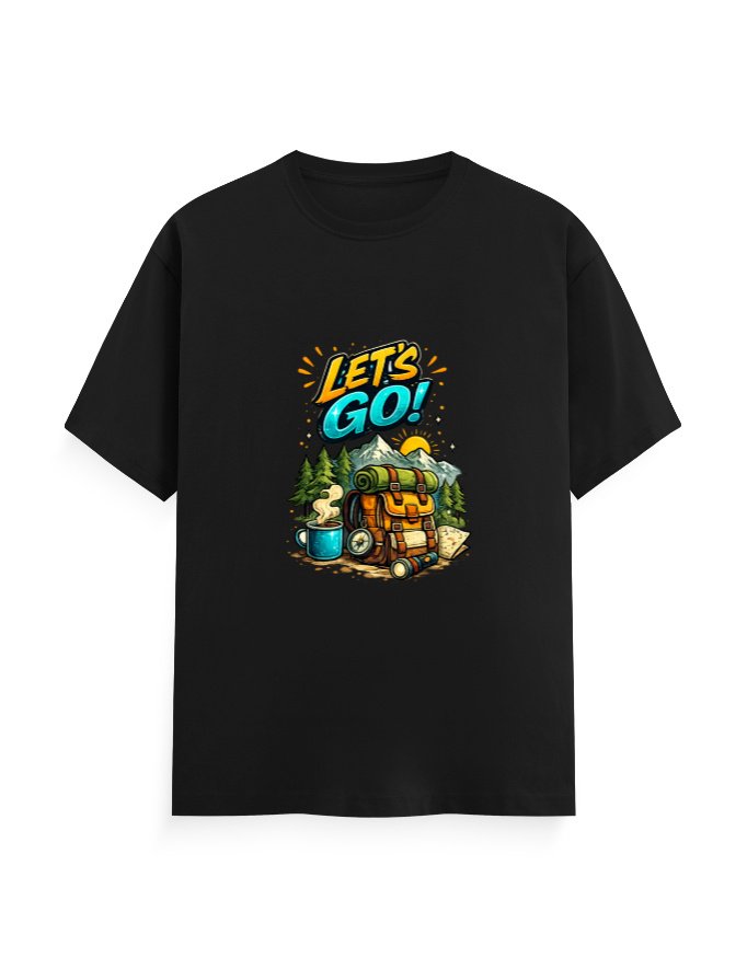 This vibrant “Let’s Go” adventure graphic T-shirt is made for explorers, travelers, and outdoor lovers. Featuring a bold camping-themed design with mountains, backpack, and travel essentials, this tee captures the spirit of freedom and adventure.